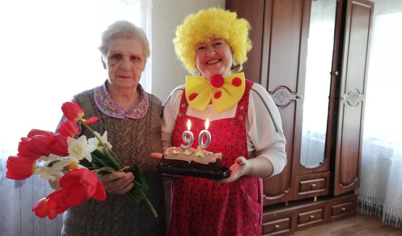 На фото: получательница социальных услуг Центра Масюкова Тамара Александровна принимает поздравления с 90-летним юбилеем от социального работника Центра Коротковой Екатерины.