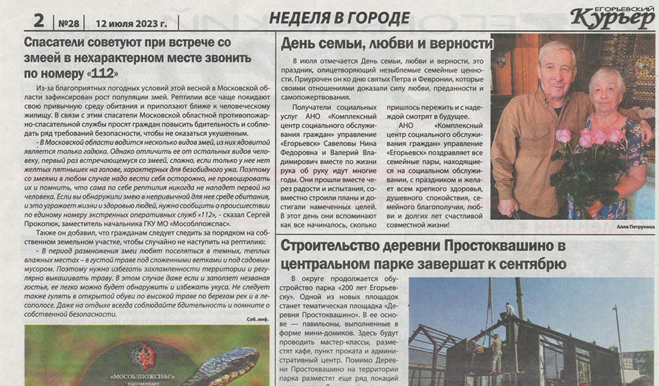 Получатели социальных услуг Центра Савеловы Нина Федоровна и Валерий Владимирович вместе по жизни рука об руку идут многие годы. Они прошли вместе через радости и испытания, совместно строили планы и достигали намеченных целей. В праздничный день они вспомнили как все начиналось, сколько пришлось пережить и с надеждой смотрят в будущее. В честь праздника в газете «Егорьевский курьер» была опубликована статья об их семье с поздравлениями и теплыми пожеланиями.