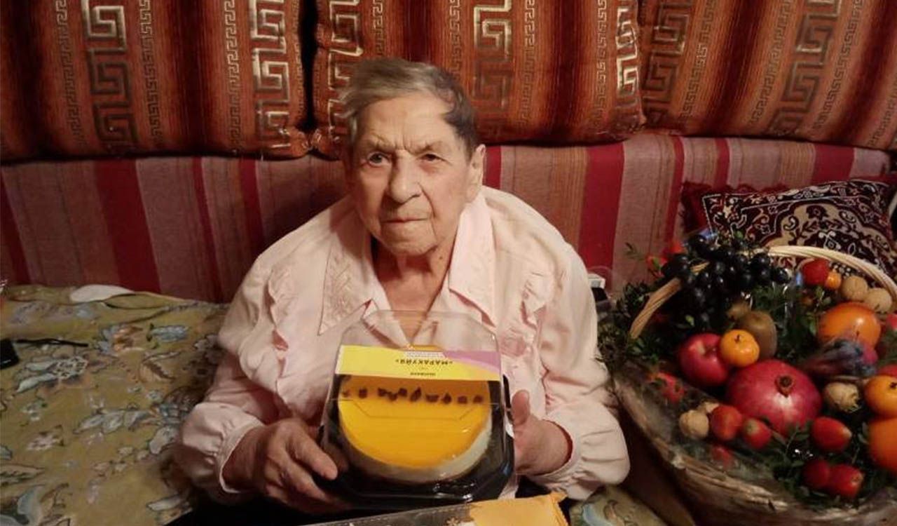 На фото: получательница социальных услуг Центра Артамошкина Клавдия Васильевна принимает поздравления со 100-летним юбилеем.