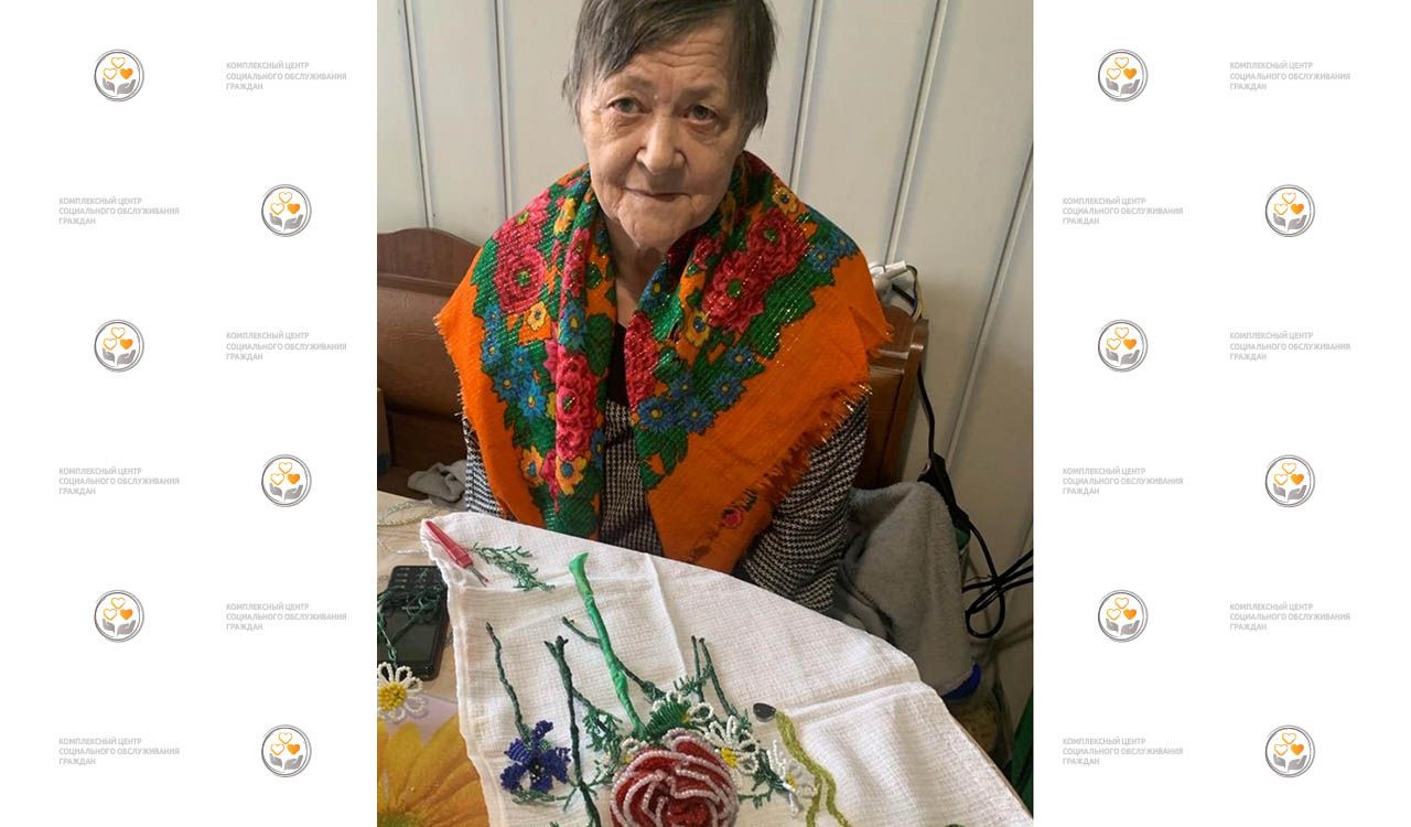 На фото: получательница социальных услуг Центра Валентина Петровна Коцкая и ее работы, созданные в технике бисероплетения.