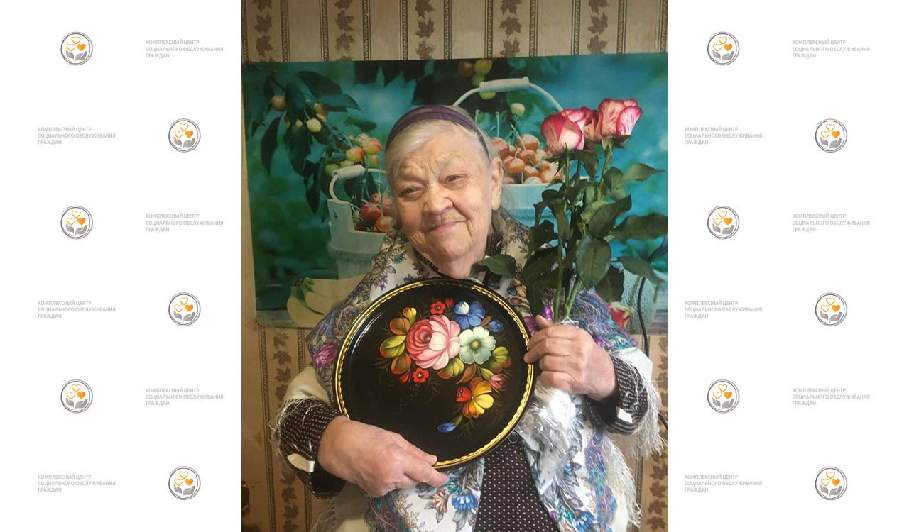 На фото: получательница социальных услуг Центра Андреева Валентина Ивановна принимает поздравления с 90-летним юбилеем.