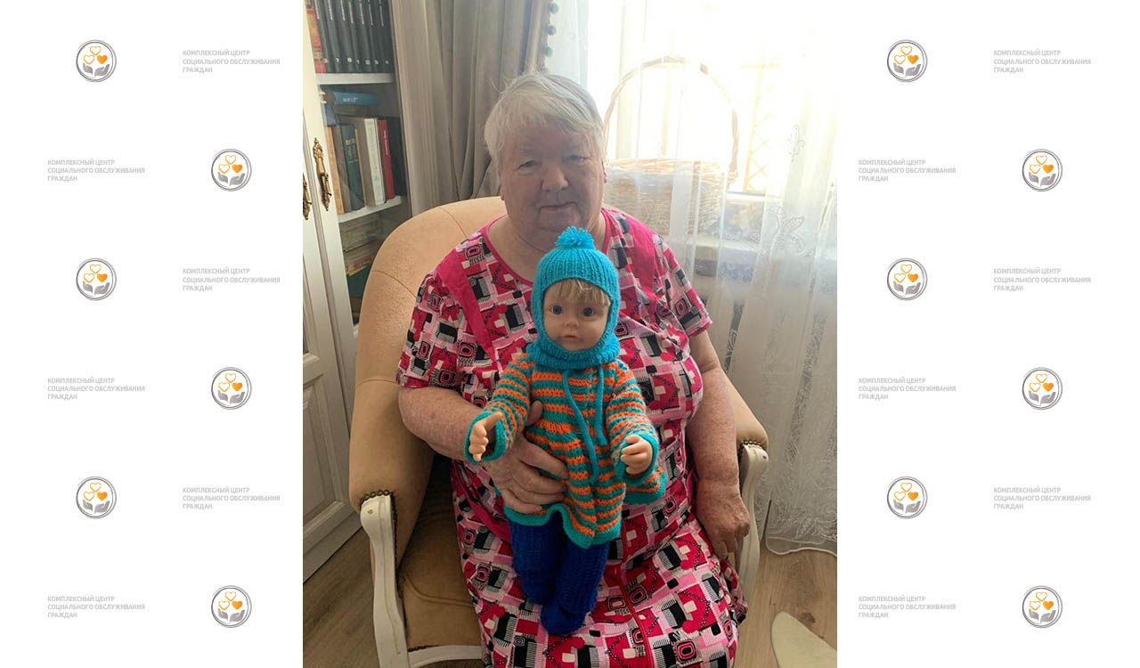 На фото: получательница социальных услуг Центра Галина Ивановна Фролова вяжет яркие наряды задорному пупсу.