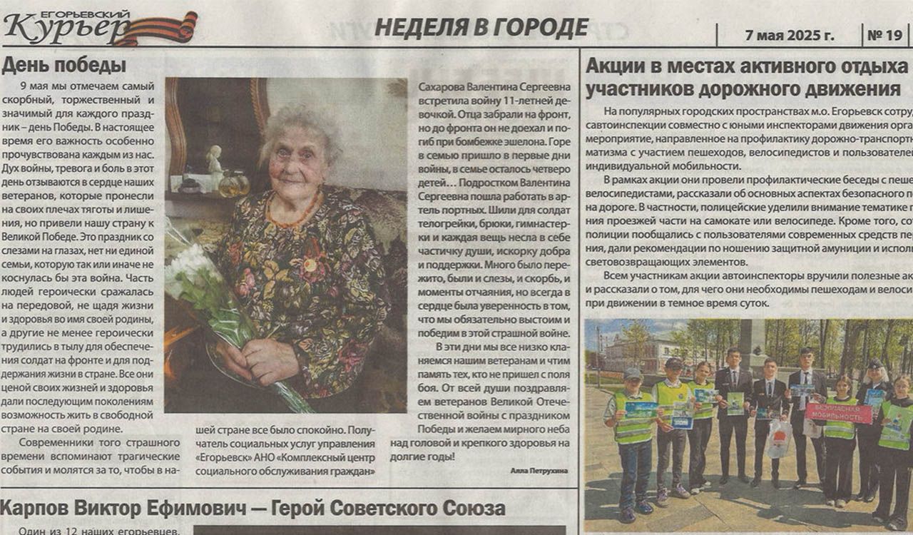 В газете «Егорьевский курьер» вышла статья о получательнице социальных услуг нашего Центра Сахаровой Валентине Сергеевне. Она рассказала о своих воспоминаниях, связанных с Великой Отечественной войной. «Я встретила войну 11-летней девочкой. Отца забрали на фронт, но до фронта он не доехал и погиб при бомбежке эшелона. Горе в семью пришло в первые дни войны, в семье осталось четверо детей…», - вспоминает Валентина Сергеевна. В годы войны приходилось много трудиться, подростком она пошла работать в артель портных. Шили для солдат телогрейки, брюки, гимнастерки и каждая вещь несла в себе частичку души, искорку добра и поддержки. «Много было пережито, были и слезы, и скорбь, и моменты отчаяния, но всегда в сердце была уверенность в том, что мы обязательно выстоим и победим в этой страшной войне», - говорит наша получательница социальных услуг.