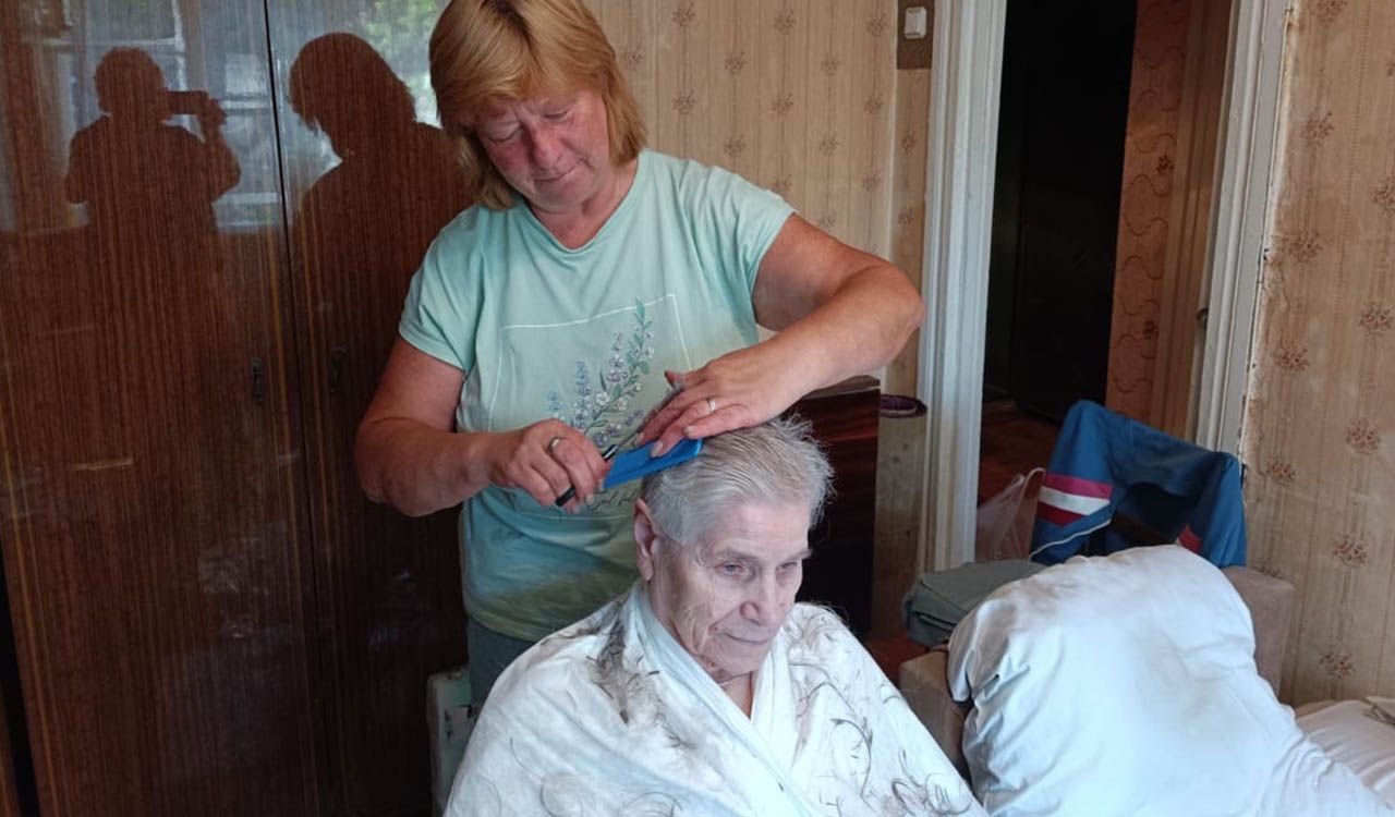 На фото: социальный работник Центра Сысоева Лариса Викторовна делает модную стрижку своей получательнице социальных услуг.