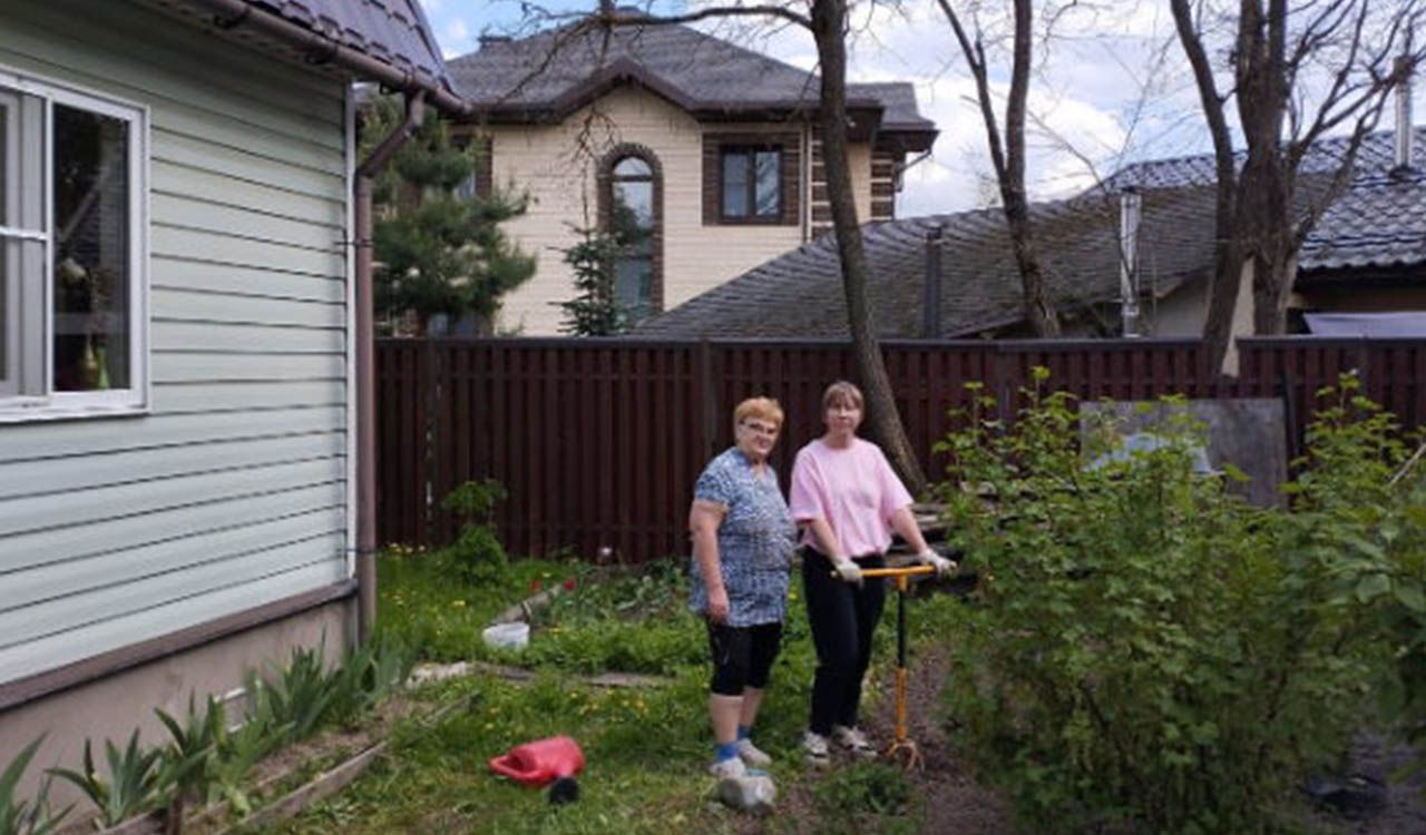 На фото: социальный работник Центра Щеткина Наталья Геннадьевна помогает получательнице социальных услуг Центра Скакун Наталье Яковлевне пересадить цветы и обработать кусты на приусадебном участке.