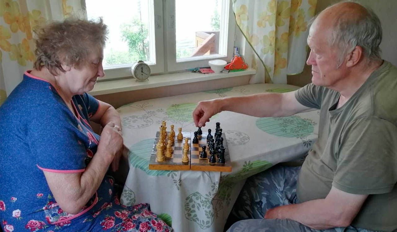 На фото: получатели социальных услуг нашего Центра Артамошины Анатолий Петрович и Надежда Петровна, Жуковы Татьяна Николаевна и Иван Викторович за игрой в шахматы.