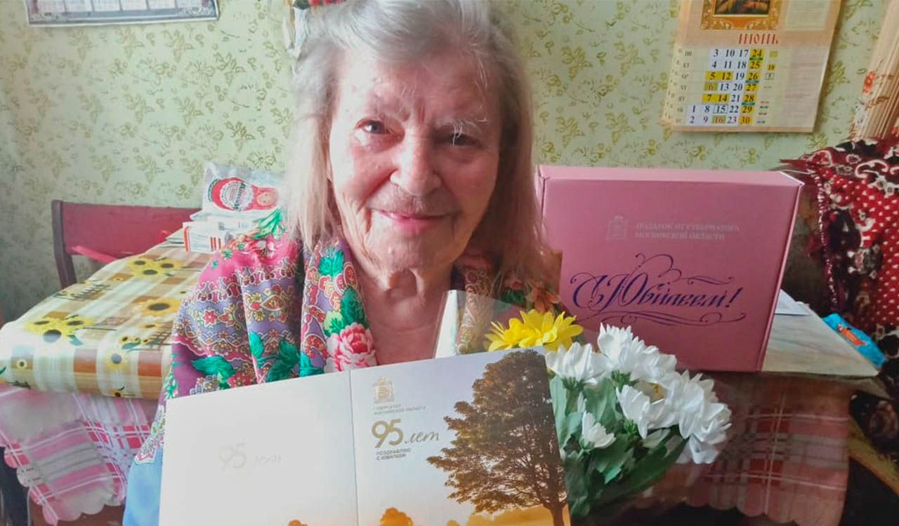 На фото: получательница социальных услуг нашего Центра Токарева Евгения Васильевна принимает поздравления с 95-летним юбилеем.
