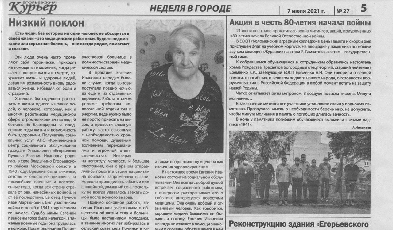 На фото: статья в газете «Егорьевский курьер» о получательнице социальных услуг нашего Центра Пучковой Евгении Ивановне.