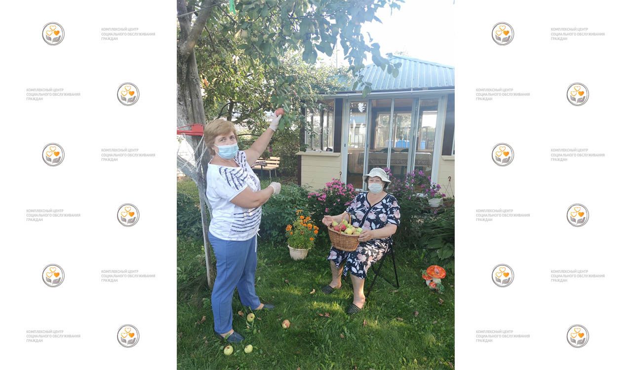 На фото: социальный работник Центра Казакова Нина Анатольевна помогает своей подопечной Чикаловой Любови Александровне со сбором урожая яблок.