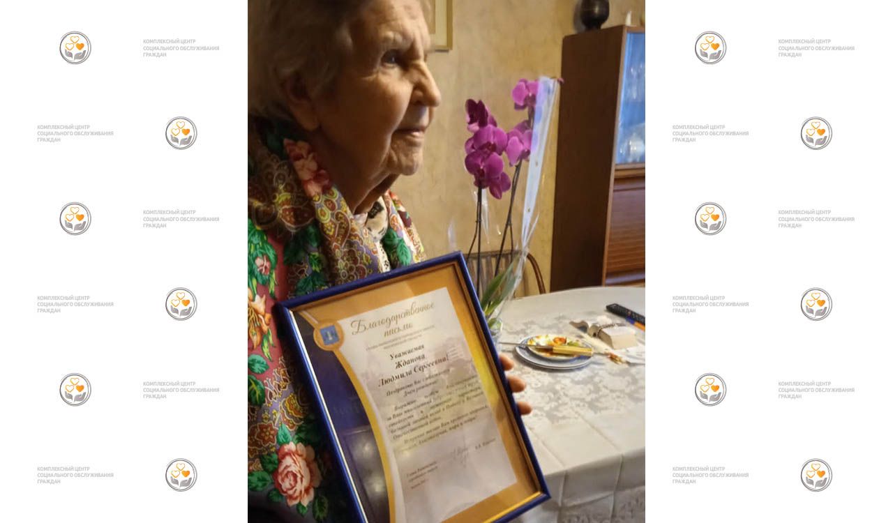 На фото: получательница социальных услуг Центра Жданова Л.С. принимает поздравления с 95 - летним юбилеем, а также ее почетные награды и медали.