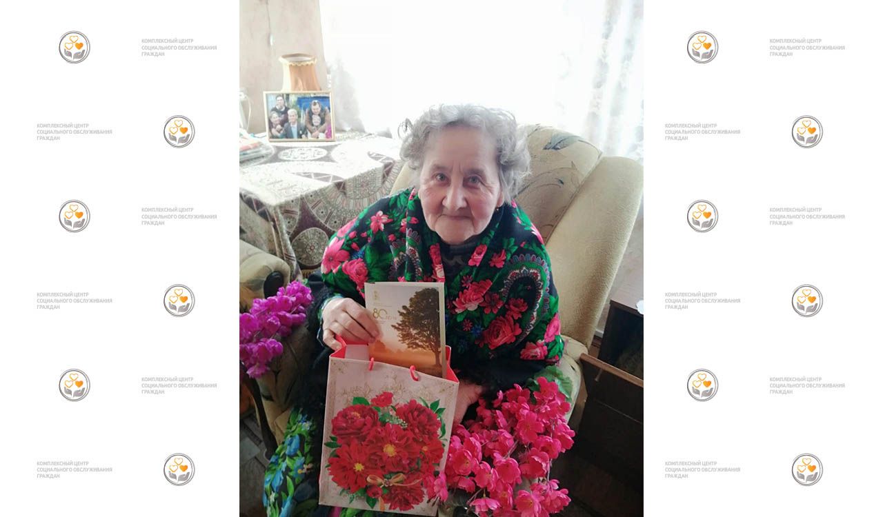 На фото: получательница социальных услуг Центра Карева Раиса Ивановна принимает подарки и поздравления в честь 80-летнего юбилея.
