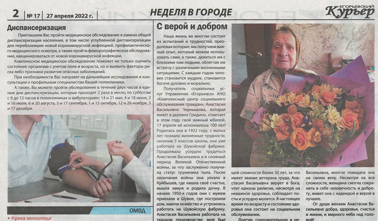 Получательница социальных услуг Центра Анастасия Васильевна Чернышова отмечает в этом году свой 100-летний юбилей! Не так давно в газете «Егорьевский курьер» вышла статья о непростой судьбе именинницы. Родилась она в 1922 году, с малых лет познала жизненные трудности, окончив 5 классов школы, уже работала на Шувойской фабрике. Продолжала усердно трудиться Анастасия Васильевна и в сложный период Великой Отечественной войны, за что заслуженно получила статус труженика тыла. После окончания войны уехала в Куйбышев, где нашла своё счастье, вышла замуж и родила дочку. В начале 1950-х годов они с мужем приехали в Шувое, где построили дом, завели хозяйство и устроились работать на Шувойскую фабрику. Анастасия Васильевна работала на ткацком производстве, муж был электриком. Проработала она в общей сложности более 50 лет, за что имеет звание ветерана труда. Анастасия Васильевна является глубоко верующим человеком, чтит каноны религии, несмотря на неважное здоровье, соблюдает посты и посвящает время молитвам.