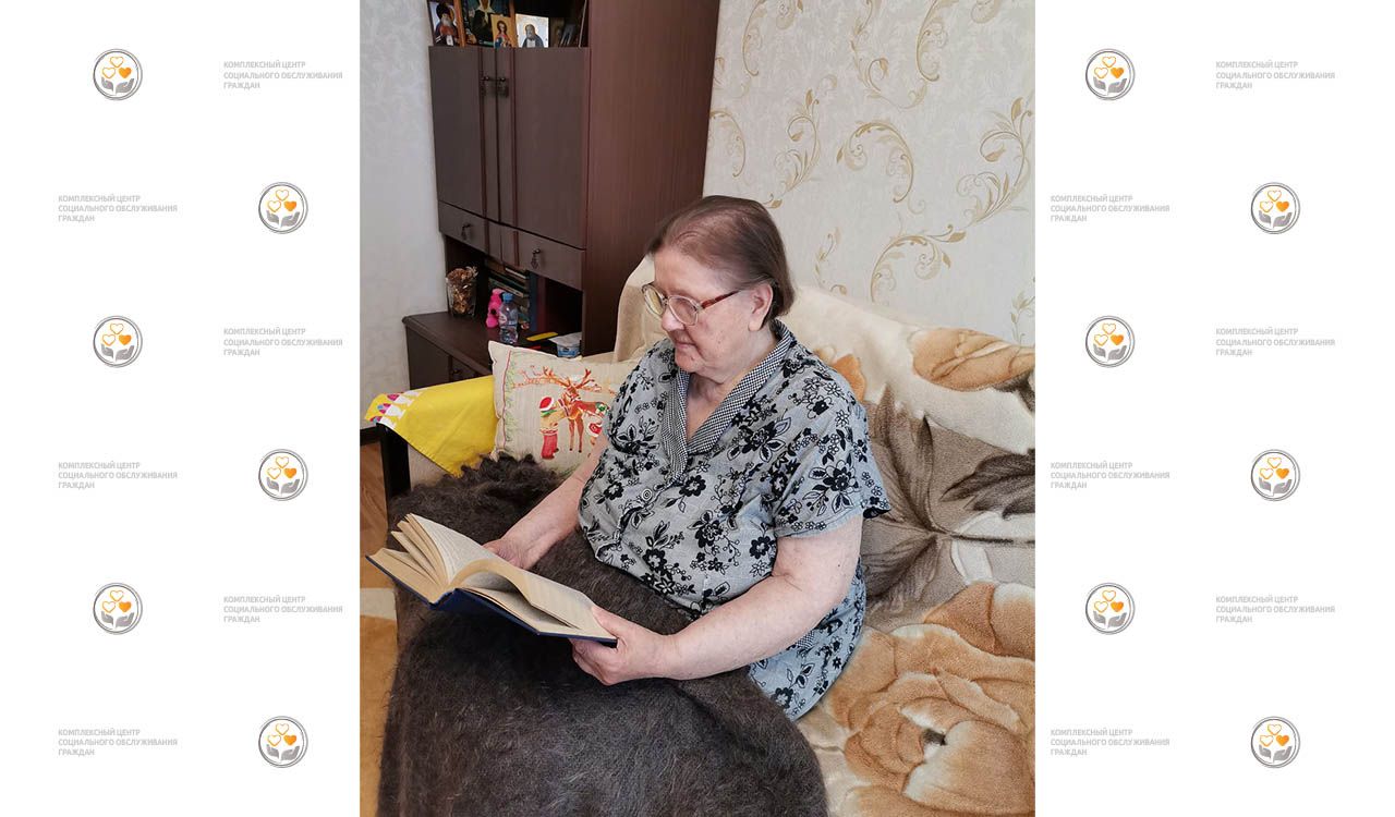 На фото: получательница социальных услуг Лукина Светлана Федоровна за прочтением очередного увлекательного романа.
