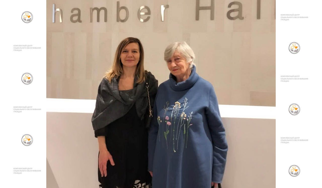 На фото: социальный работник Сажаева И.В. сопроводила свою подопечную Парамонову Викторию Андреевну на концерт в «Зарядье».