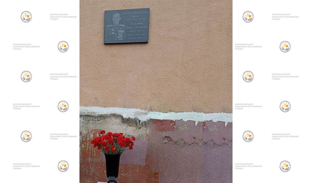 На фото: памятная мемориальная доска в честь Героя Советского Союза, участвовавшего в Великой Отечественной войне, Глазкова Павла Петровича, который является отцом получательницы социальных услуг нашего Центра Жигулиной Тамары Павловны.