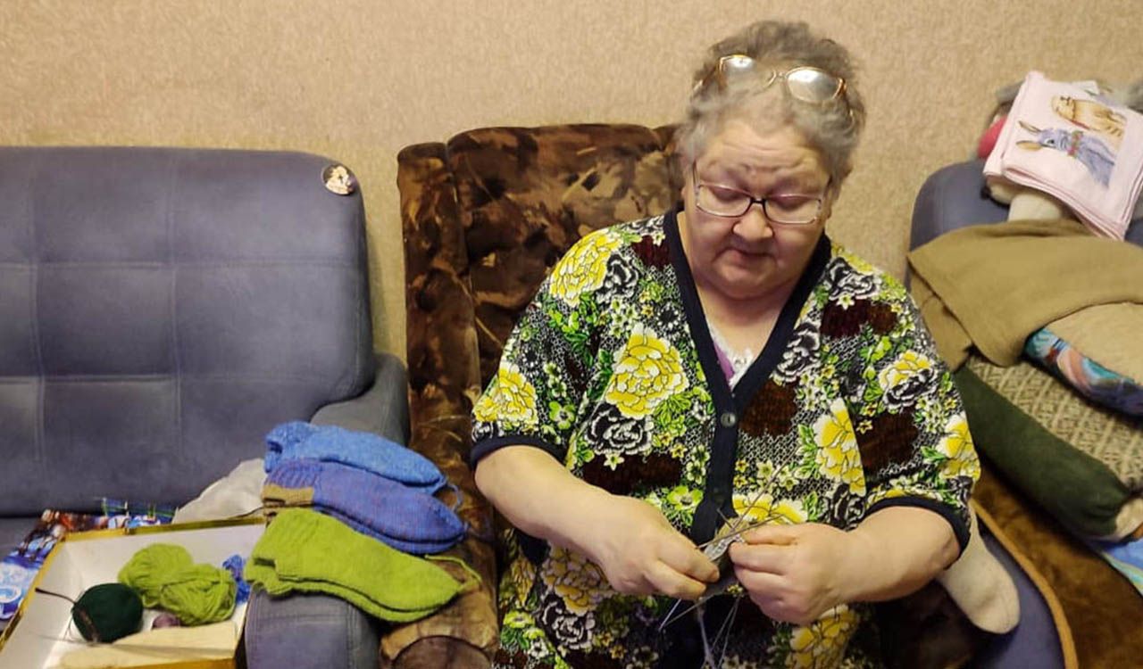 На фото: получательница социальных услуг Центра Татьяна Николаевна Сидорова за вязанием и вещи, которые она создала своими руками.