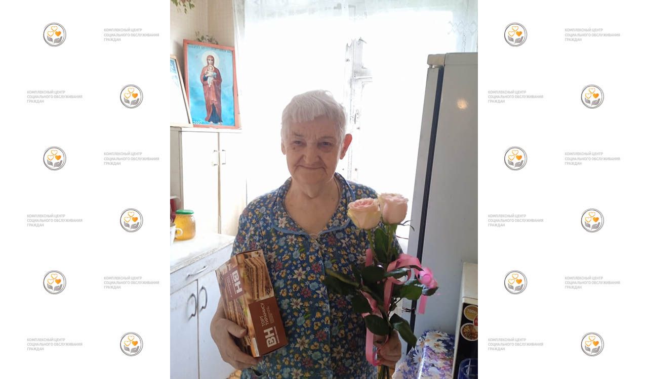 На фото: получательница социальных услуг Центра Комолова Нина Николаевна принимает поздравления с 90-летним юбилеем.