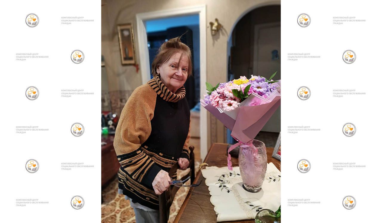 На фото: получательница социальных услуг Центра Раиса Ивановна Петушкова принимает поздравления с 85-летним юбилеем.