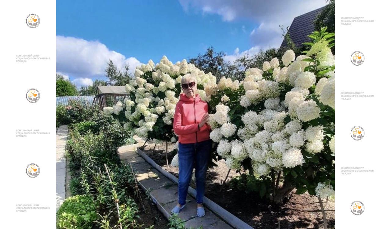 На фото: социальный работник Центра Савина Ольга Алексеевна на фоне прекрасных гортензий, которые она вырастила на своем дачном участке.