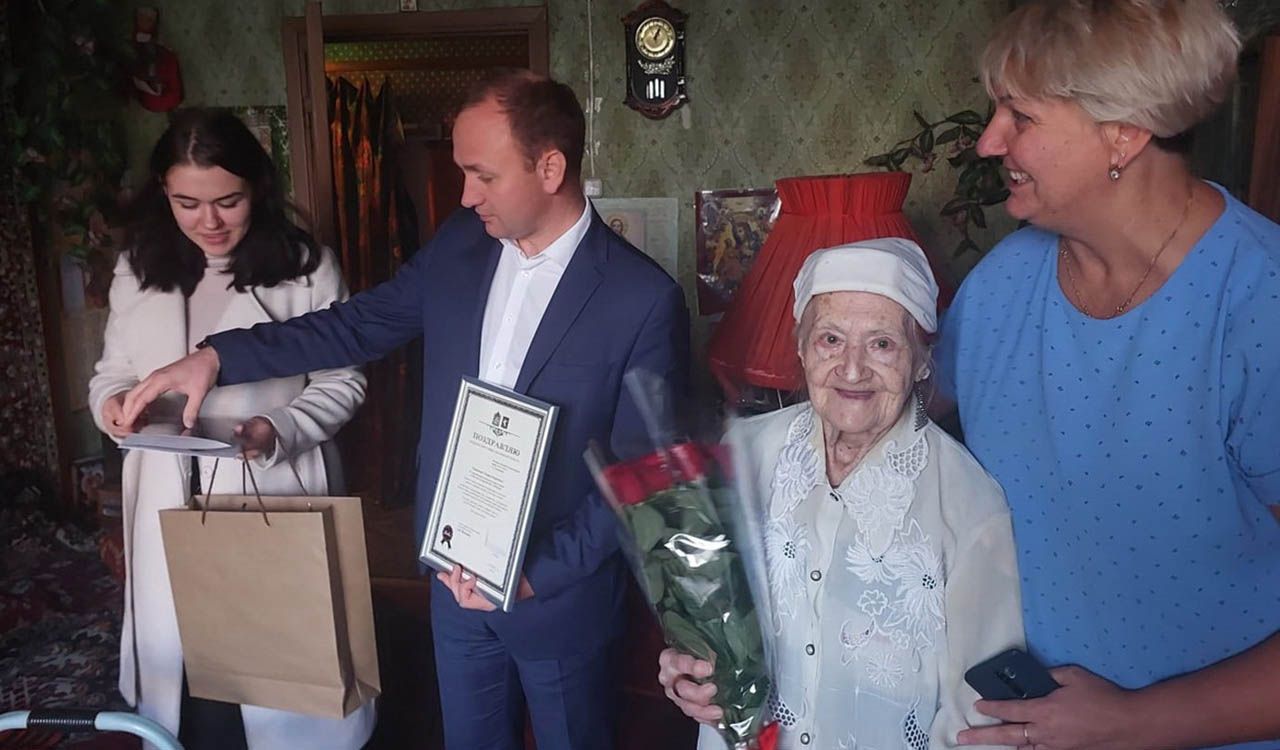 На фото: получательница социальных услуг Центра Ломакина Тамара Андреевна принимает поздравления с 95-летним юбилеем.