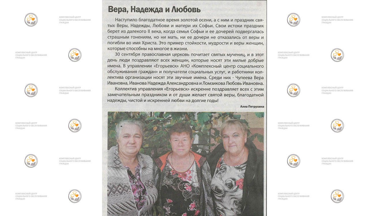 30 сентября православная церковь почитает святых мучениц и в этот день люди поздравляют всех женщин, которые носят эти милые добрые имена. Коллектив Центра поздравил обладательниц этих прекрасных русских имен на страницах издания «Егорьевский курьер». От всей души желаем святой веры, благодатной надежды, чистой и искренней любви на долгие годы!