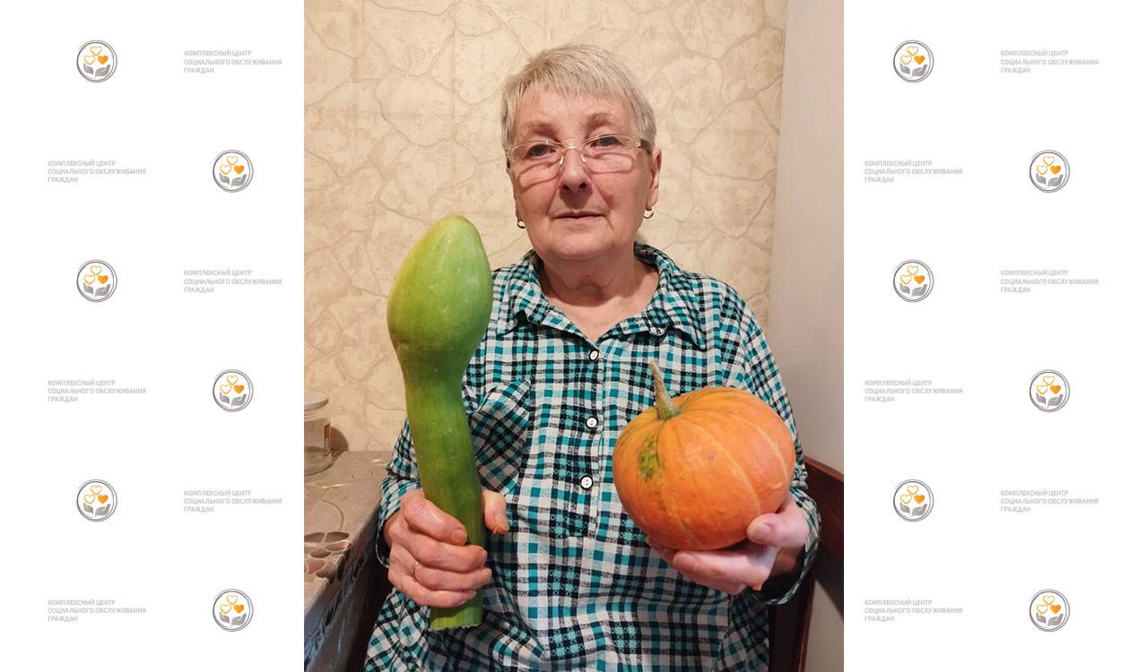 На фото: получательница социальных услуг Центра Русакова Татьяна Николаевна и тыквы, котоыре она вырастила на своем приусадебном участке.