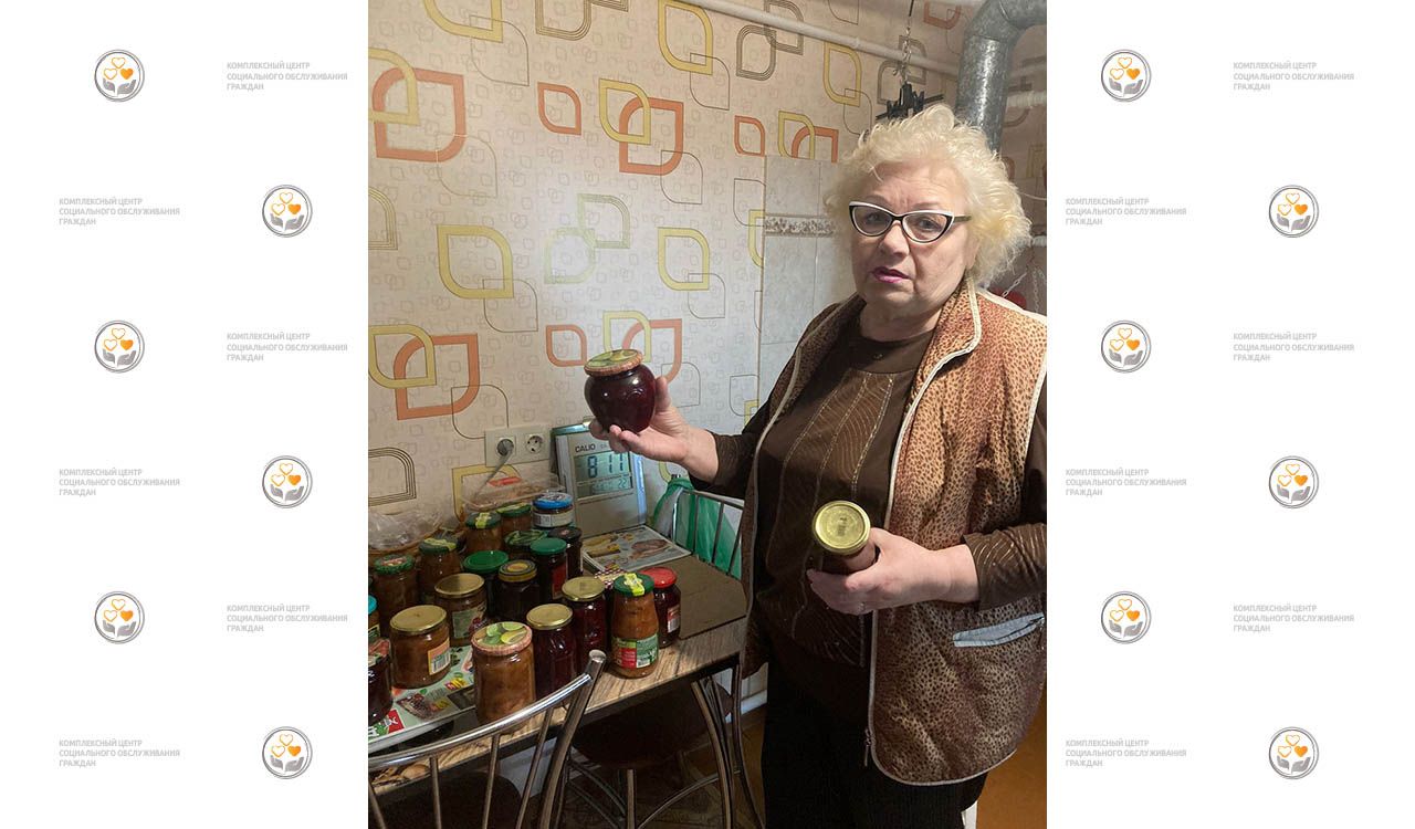 Наша получательница никогда не сидит без дела, а уж тем более сейчас, когда в самом разгаре сезон домашних зимних заготовок. Еще с юных лет увлеклась Елена Николаевна кулинарией. А особенно ей всегда нравилось закрывать на зиму баночки с различными соленьями и вареньем. Не оставила она своё увлечение и в зрелом возрасте. Правда выходить из дома Елене Николаевне с каждым годом все труднее и труднее. Поэтому ей помогает социальный работник Старцева Светлана Михайловна, которая покупает на рынке овощи и фрукты, моет их и режет. В нынешнем сезоне уже закрыто много баночек с вкуснейшими соленьями, маринадами и вареньем.
