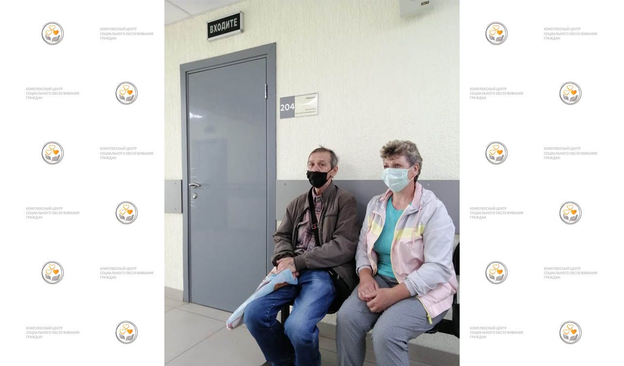 На фото: социальный работник Центра Силакова Александра Николаевна и получатель социальных услуг Воруничев Петр Михайлович ожидают приема врача в поликлинике.