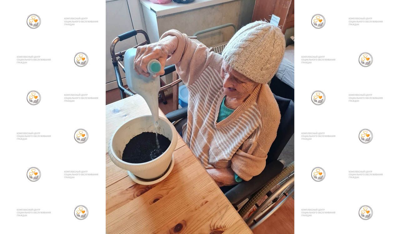 На фото: получательница социальных услуг Центра Ярошевская Мария Николаевна посадила в землю семена и поливает их, чтобы они порадовали всходами.