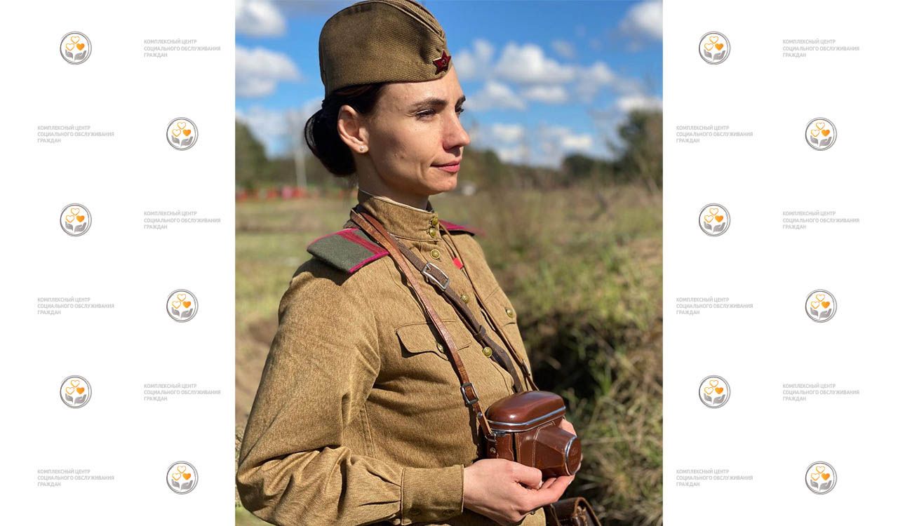 На фото: социальный работник Центра Утенина Ольга Игоревна во время участия в военно-историческом фестивале «Рубеж обороны» Восточный фронт весна 1945г.