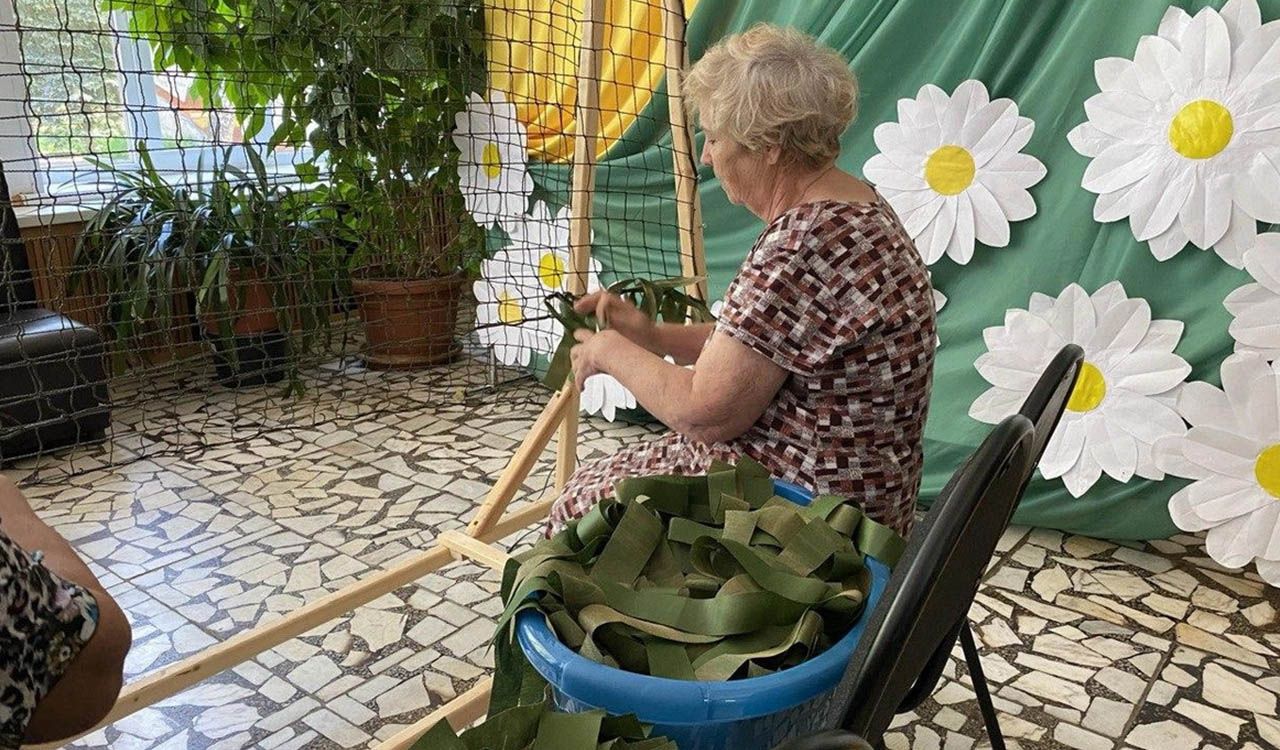 На фото: получательница социальных услуг Центра Марусева Галина Владимировна в свободное время плетет маскировочные сети для нужд СВО.