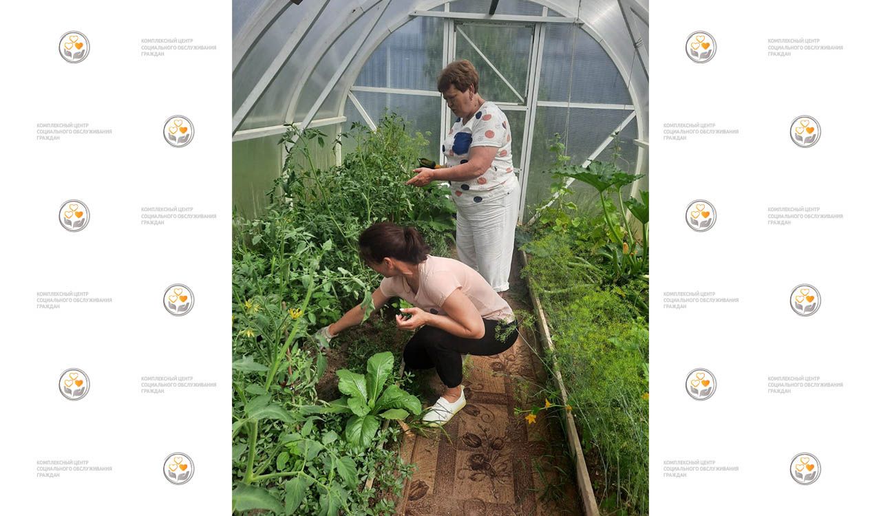 На фото: социальный работник Центра Дьякова Олеся Петровна и получательница социальных услуг Центра Гераськина Галина Андреевна пропалывают грядки с огурцами и собирают урожай для заготовки на зиму.