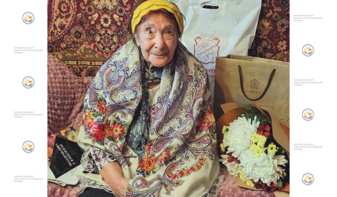 На фото: получательница социальных услуг нашего Центра Моздокова Вера Александровна принимает поздравления со 100-летним юбилеем.