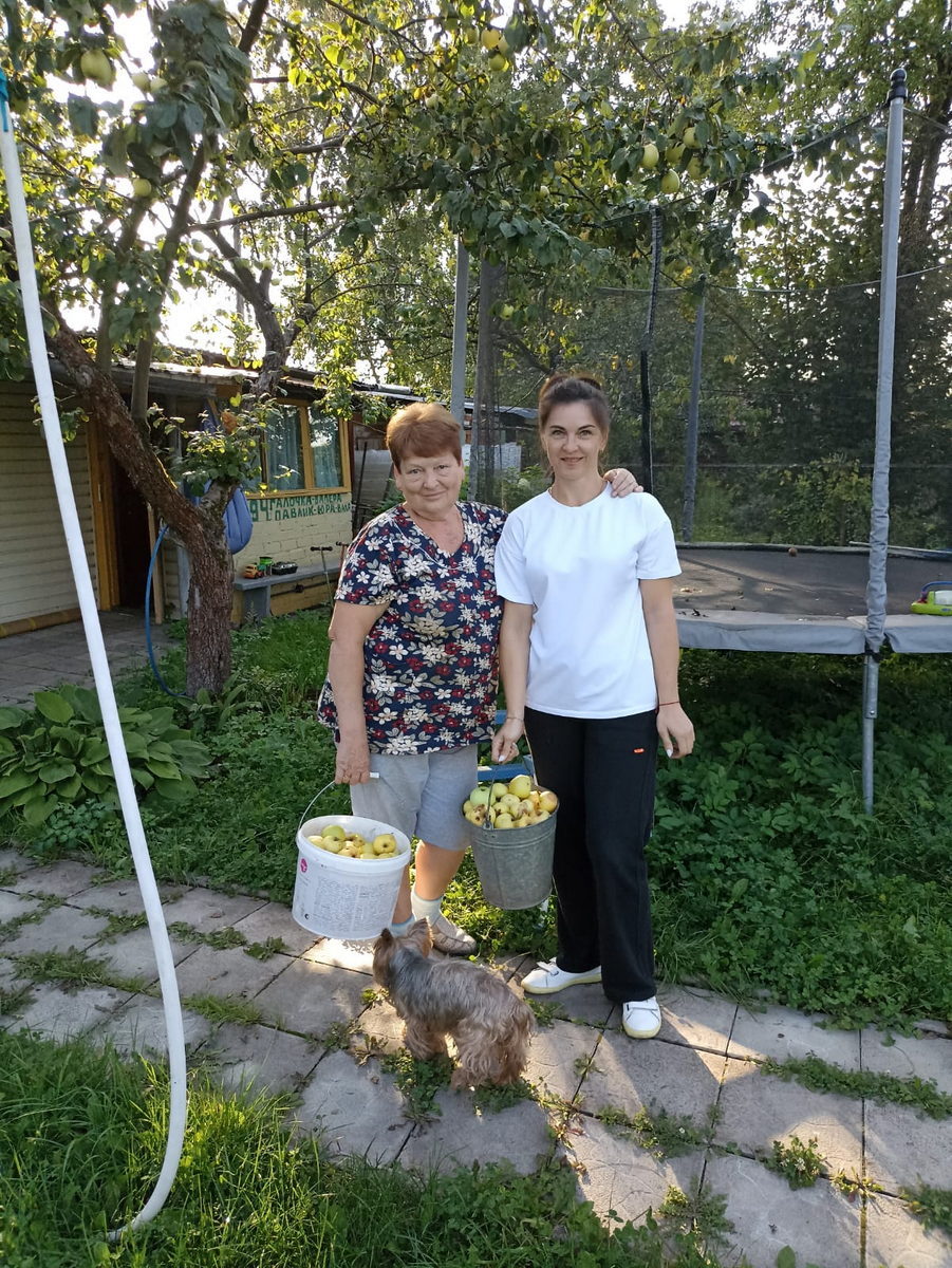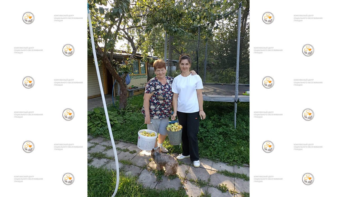 На фото: социальный работник Центра Дьякова Олеся Петровна помогает собрать урожай получательнице социальных услуг Центра Гераськиной Галине Андреевне.