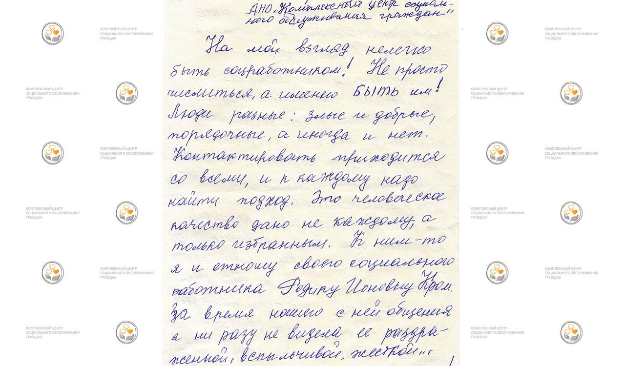 Получатели социальных услуг Центра нередко выражают свою благодарность, отправляя очень трогательные письма, в которых отмечают значимость и трудолюбие своих социальных работников. Эти благодарности становятся ярким свидетельством того, как важен и незаменим труд сотрудников Центра, которые ежедневно оказывают поддержку и помощь людям в сложных жизненных ситуациях.
