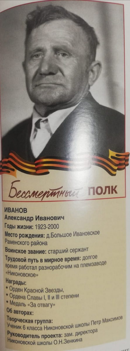Вот и наша получательница социальных услуг Зоя Александровна Куприна в своей жизни прошла через многие испытания. Она родилась 1956 году в деревне Большое Ивановское в семье фронтовиков. С самого раннего детства, она с братом и сестрой во всём помогали родителям - работали на полях и сенокосе, ухаживали за животными. Домашней работы всегда хватало. Семья была героическая. Мать - Иванова Александра Алексеевна, во время ВОВ ушла на фронт связисткой и вернулась домой после тяжелого ранения в ногу. Отец - Иванов Александр Иванович, родился в 1923 году, в крестьянской семье, где росло 8 детей. Окончил 4 класса школы, а затем поступил на работу в колхоз. Когда ему исполнилось 18 лет, был призван в ряды Красной Армии. Здесь Александр Иванович овладел военной специальностью, стал наводчиком орудия. Он прошел всю войну до победного конца. Пройденный им путь был наполнен героическими подвигами, за что был награжден: Орденом Красной Звезды, Орденом Славы 1,2 и 3 степени и медалью «За Отвагу». Сама Зоя Александровна говорит, что отец не любил вспоминать о войне, и постоянно уходил от расспросов детей и родственников. Наша подопечная вспоминает о нем, как о добром и мужественном человеке. Александр Иванович дожил до 77 лет и был похоронен в родной деревне. На площади Победы, в городе Раменское его имя увековечено на мраморной плите обелиска. На доме, где он проживал, повесили мемориальную доску памяти.
