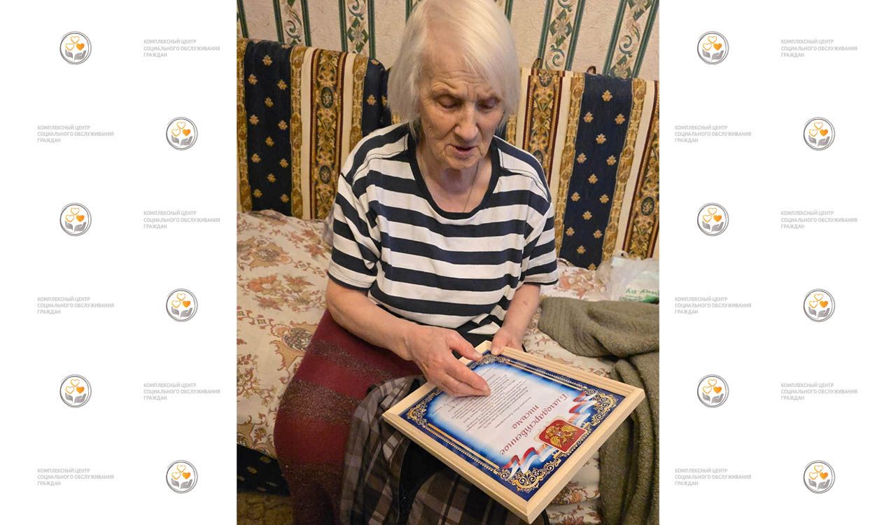 На фото: получательница социальных услуг Центра Аксенова Нина Александровна и благодарственное письмо, которое пришло в ее адрес из войсковой части.
