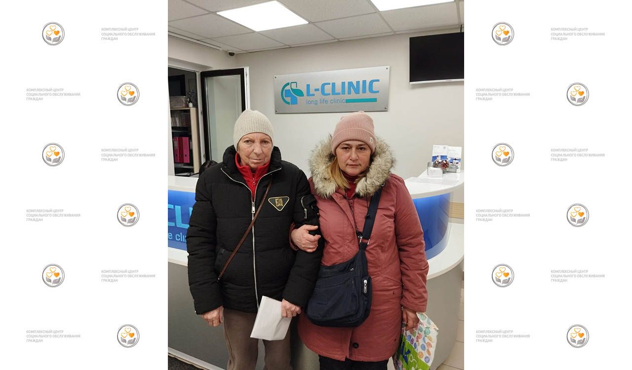 На фото: социальный работник Центра Ульянова Екатерина сопровождает получательницу социальных услуг Центра Перевезенцеву Наталью Ивановну в медицинское учреждение.