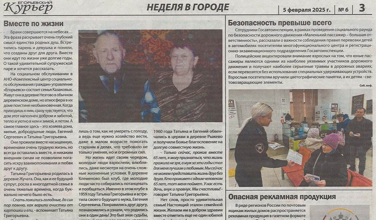 На фото: статья о получателях социальных услуг Центра супругах Казаковых в газете «Егорьевский курьер»