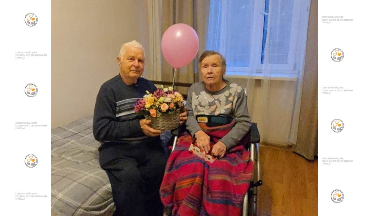 На фото: получательница социальных услуг Центра Савицкая Раиса Алексеевна вместе с мужем Савицким Вячеславом Глебовичем принимают поздравления с Днем рождения от сотрудников Центра.