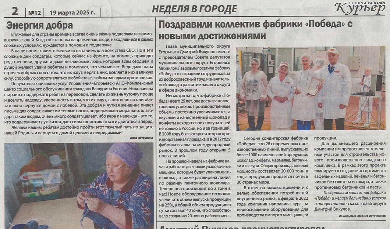 О получательнице социальных услуг нашего Центра, Вашуриной Евгении Николаевне написала газета «Егорьевский курьер». Ее бескорыстная помощь и поддержка бойцов, участвующих в СВО, заслуживают глубокого уважения. Она делает все возможное, чтобы подарить солдатам тепло и заботу, которые так необходимы в тяжелые моменты.