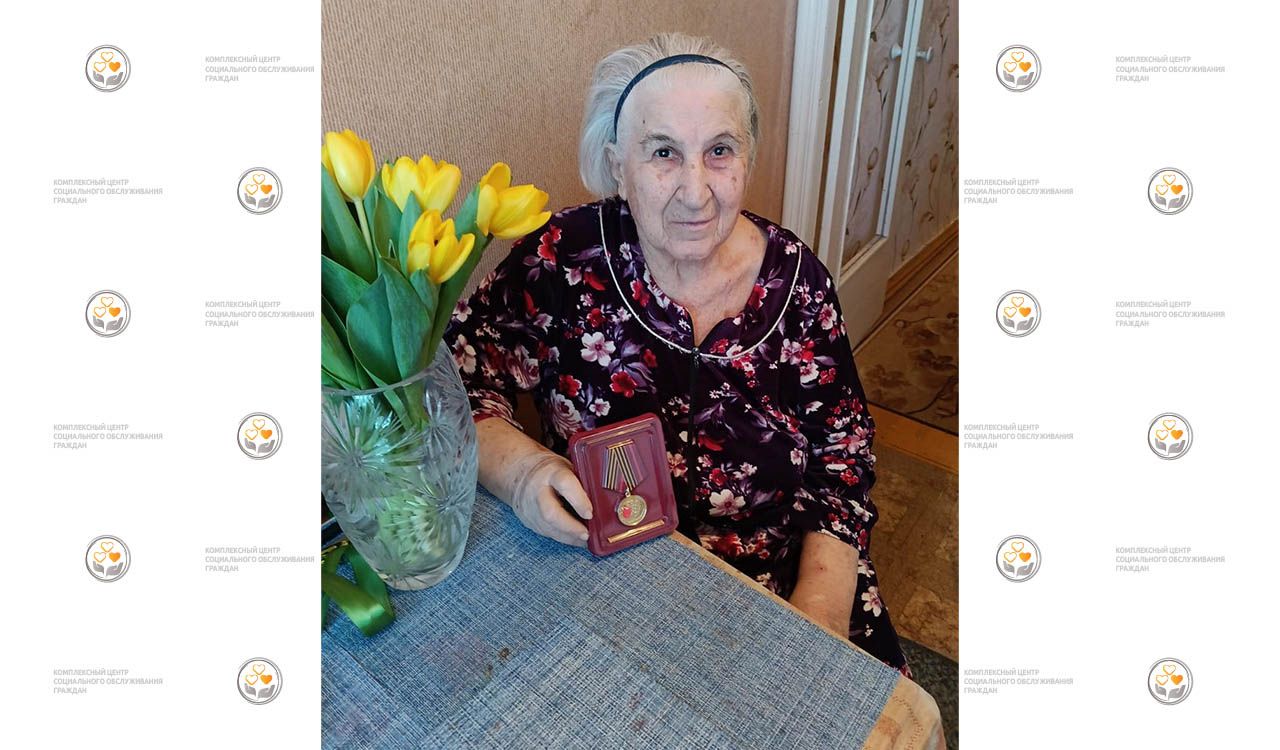 На фото: получательница социальных услуг Центра Старова Мария Наумовна с почетной наградой - юбилейной медалью к 80-й годовщине Победы в Великой Отечественной войне.