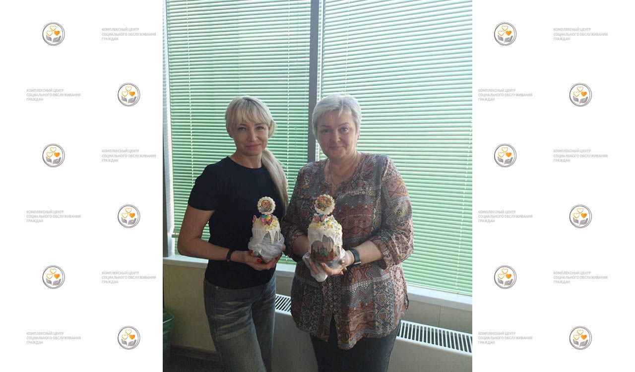 На фото: социальный работник Центра Нефедова Елена Викторовна и пасхальные куличи, которые она испекла своими руками.