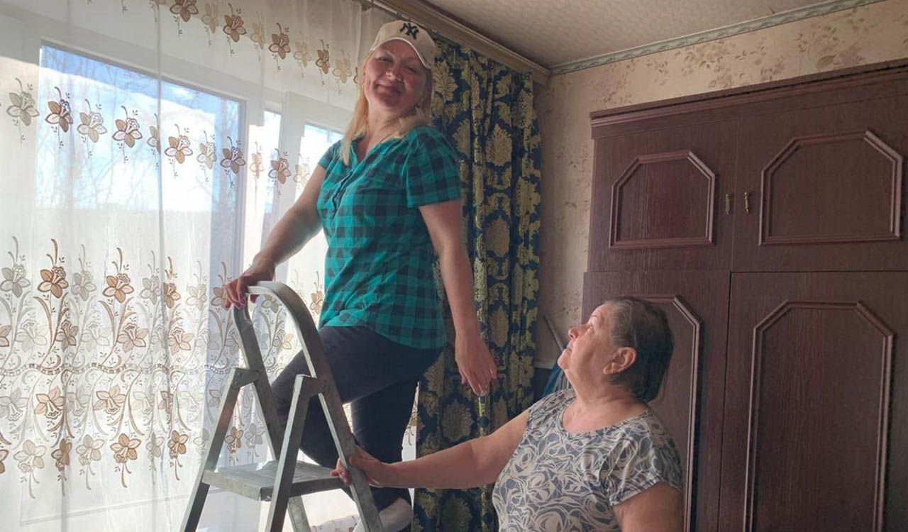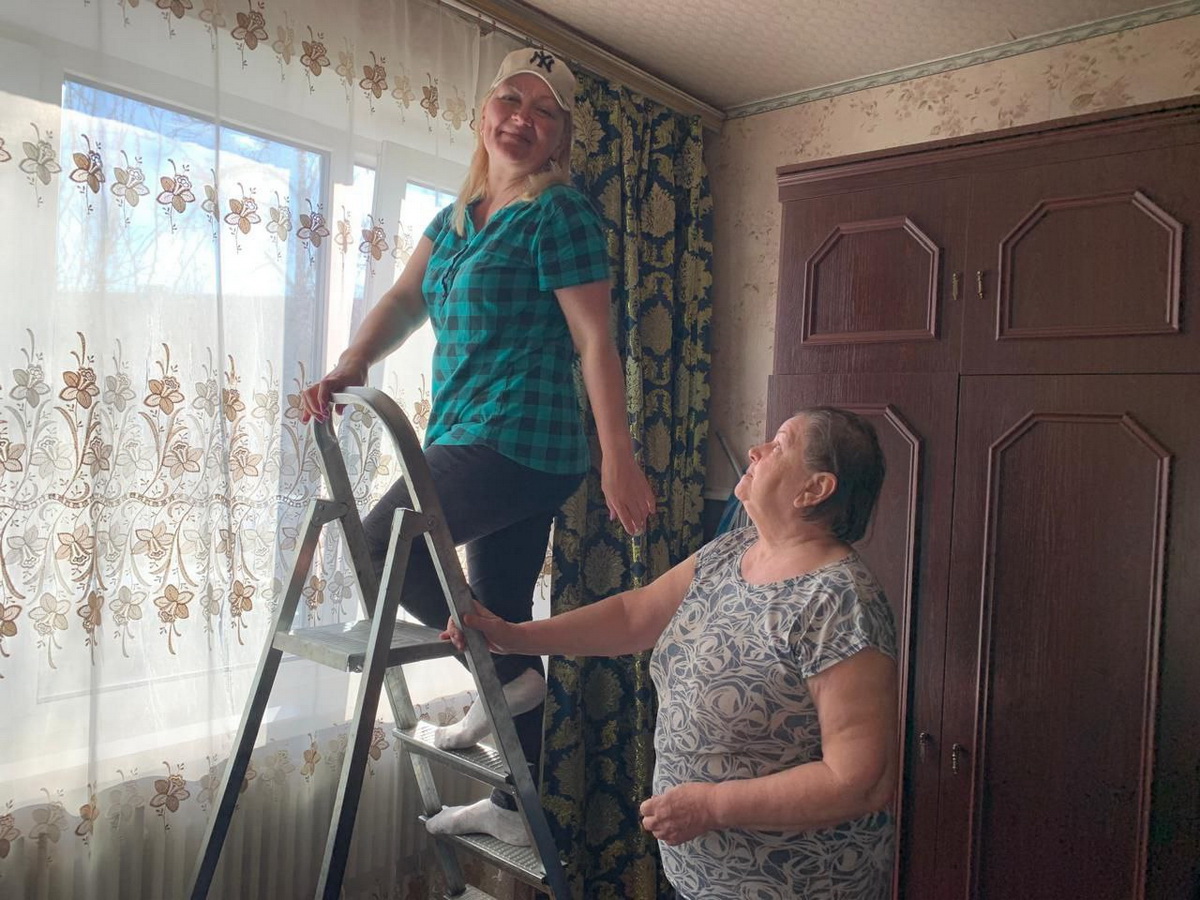На фото: социальные работники Центра моют окна в квартирах получателей социальных услуг Центра.