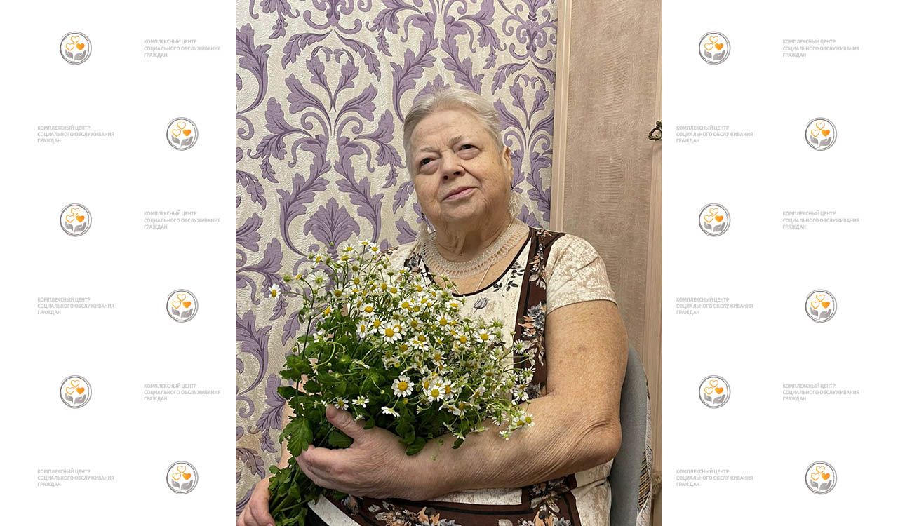 Не так давно отметила праздничную дату наша получательница социальных услуг Симонова Елена Кузьминична, которой в этом году исполнилось 75 лет. В этот день нам хотелось подарить имениннице прекрасное настроение. Социальный работник Центра одной из первых навестила Елену Кузминичну, поздравила и передала самые теплые и сердечные слова от всего коллектива Центра. Милый букетик ромашек напомнил ей молодые годы и зарядил положительными эмоциями.