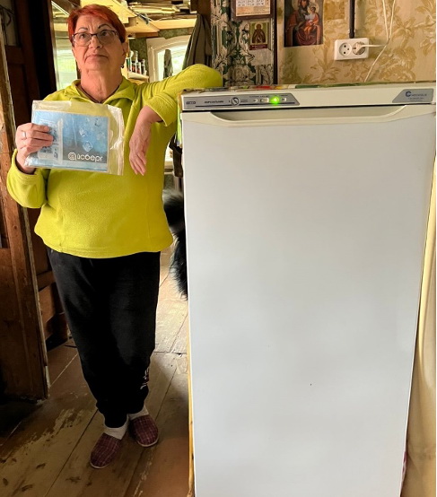 На фото: получательница социальных услуг Центра Дорская Нина Викторовна с новым холодильником.