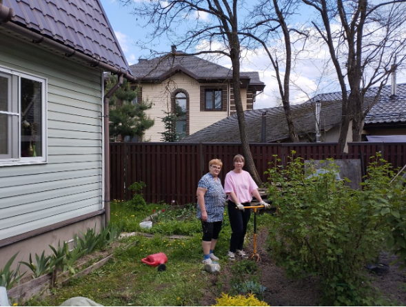 На фото: социальный работник Центра Щеткина Наталья Геннадьевна помогает получательнице социальных услуг Центра Скакун Наталье Яковлевне пересадить цветы и обработать кусты на приусадебном участке.