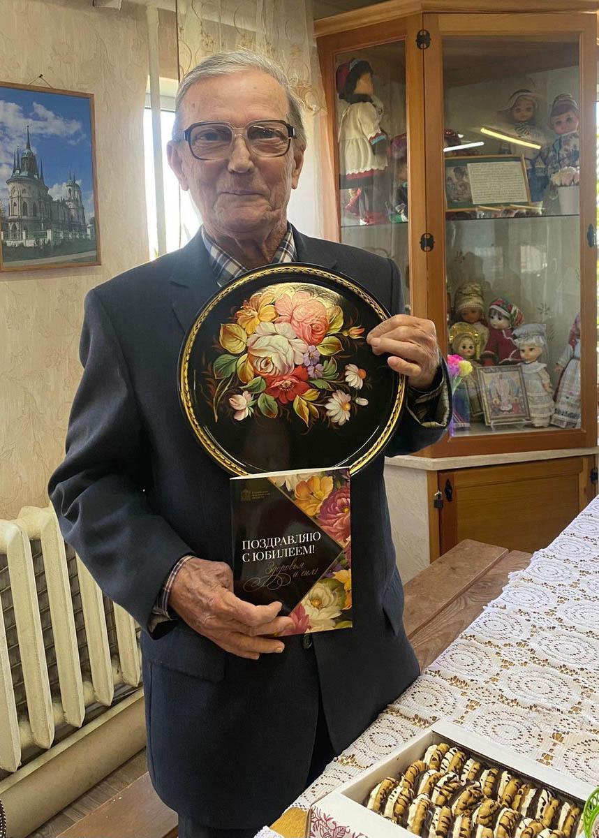 На фото: получатель социальных услуг Центра Дугарский Константин Петрович принимает поздравления с юбилеем.
