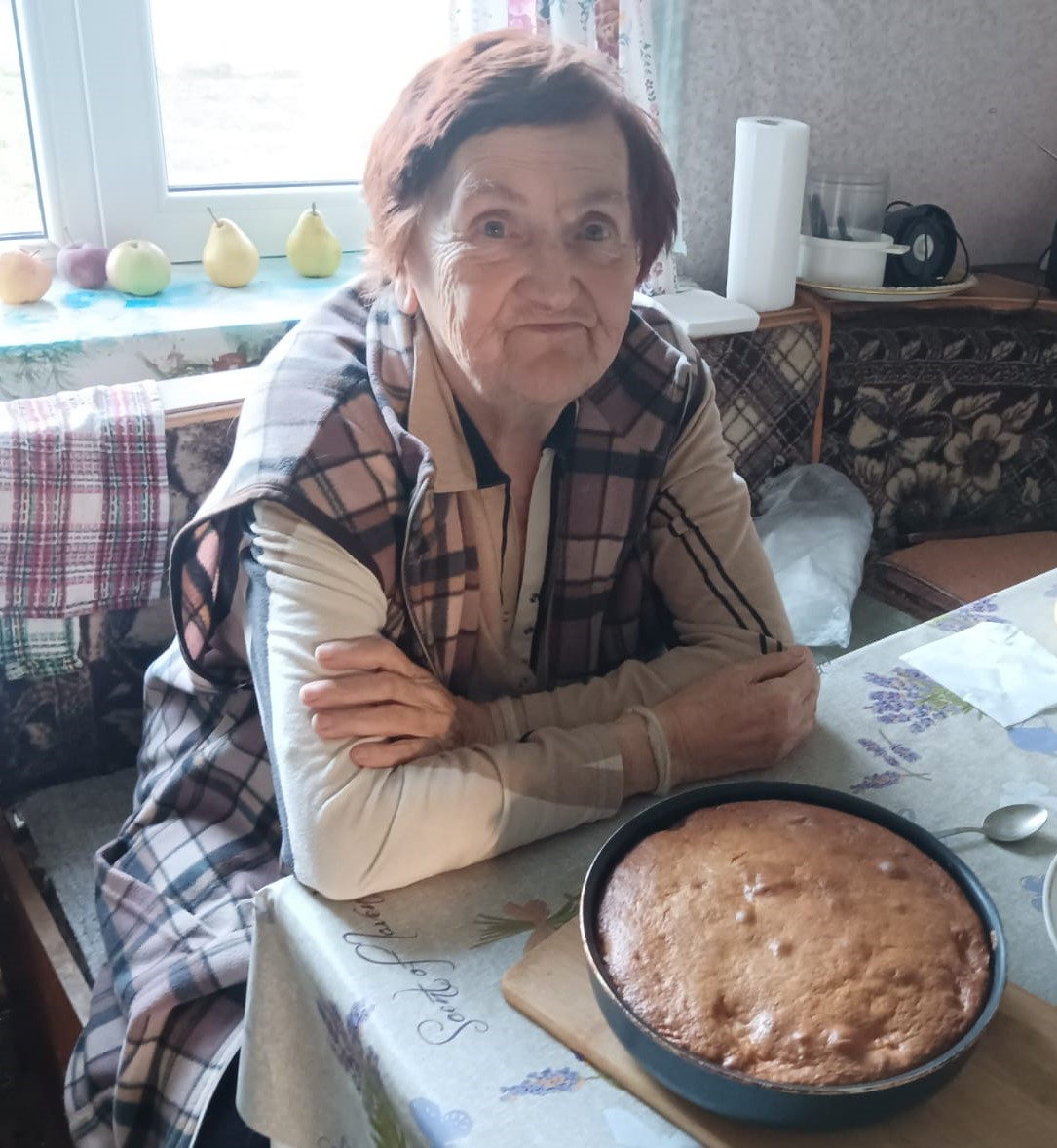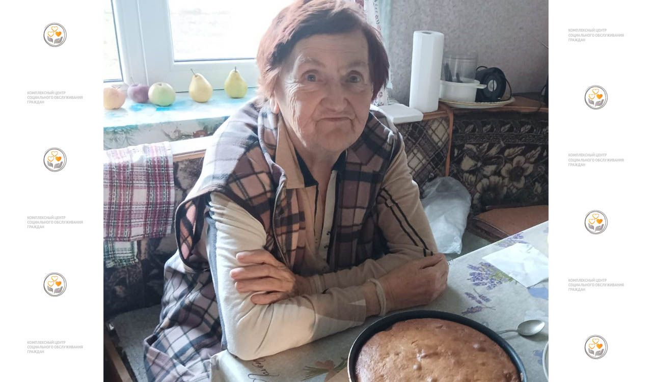 На фото: получательница социальных услуг нашего Центра Семенова Александра Ивановна и ее фирменная шарлотка, которую они испекли вместе со социальным работником Центра Задоркиной Оксаной.