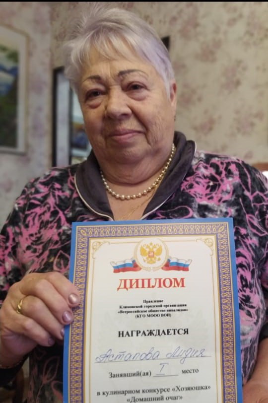 Получательница социальных услуг Центра Астапова Лидия Николаевна – кулинар с большим стажем. Она очень любит готовить самые различные блюда, а также с большим интересом ищет новые рецепты и способы приготовления. Все, кто пробовал ее блюда – не могут забыть вкус и аромат этих гастрономических шедевров. Ей одинаково прекрасно удаются салаты, горячее, выпечка, десерты. Не так давно Лидия Николаевна приняла участие в кулинарном конкурсе «Хозяюшка», который был организован при активном участии «Всероссийского общества инвалидов». Наша получательница социальных услуг заняла самое почетное первое место. На суд экспертного кулинарного жюри она представила коврижку «Медовая» и салат «Грибной». Члены жюри были в восторге от ее мастерства и вкуса блюд. Мы от всей души поздравляем Лидию Николаевну с победой и желаем ей дальнейших успехов в ее вкусном хобби!